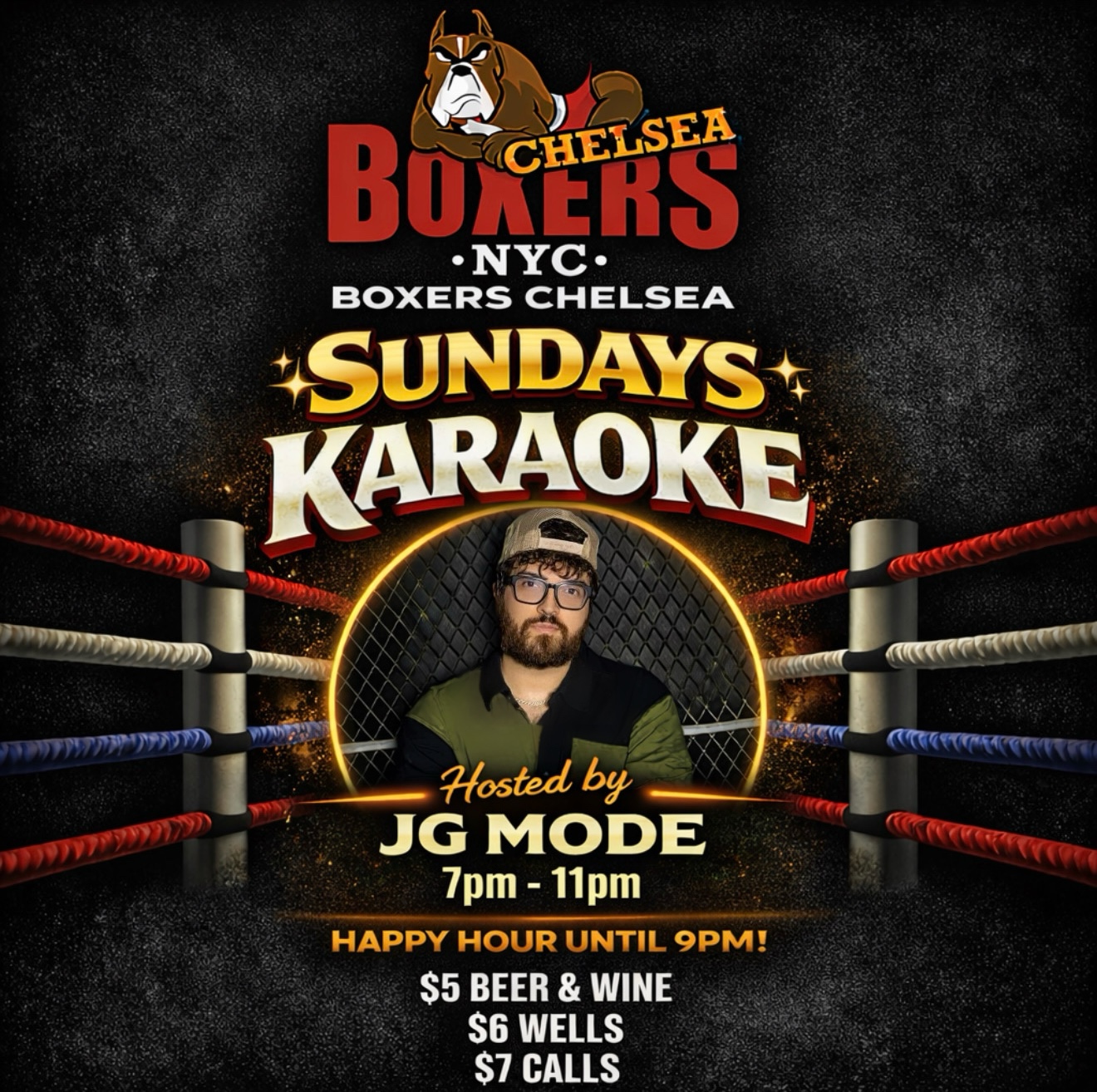 SundayKaraoke! Tuesdays and Sundays Come sing your heart out with your friends and your favorite Boxers Bartenders. Hosted by JG Mode. Happy Hour until 9PM!