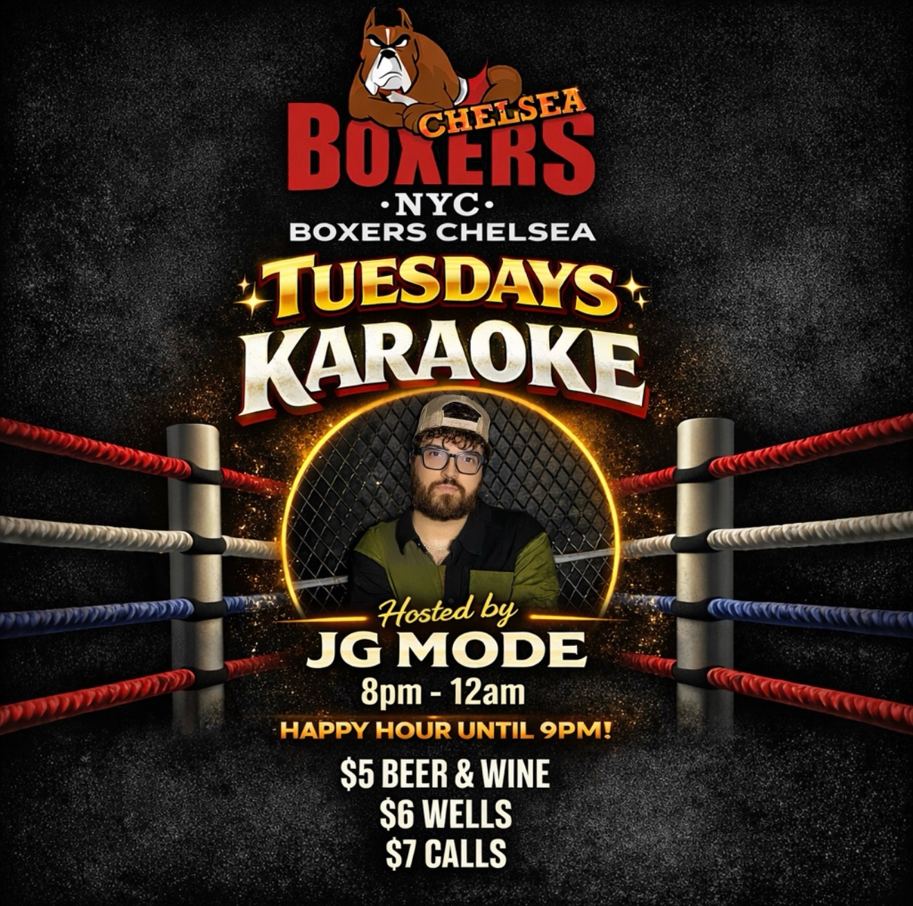 TuesdayKaraoke! Tuesdays and Sundays Come sing your heart out with your friends and your favorite Boxers Bartenders. Hosted by JG Mode. Happy Hour until 9PM!