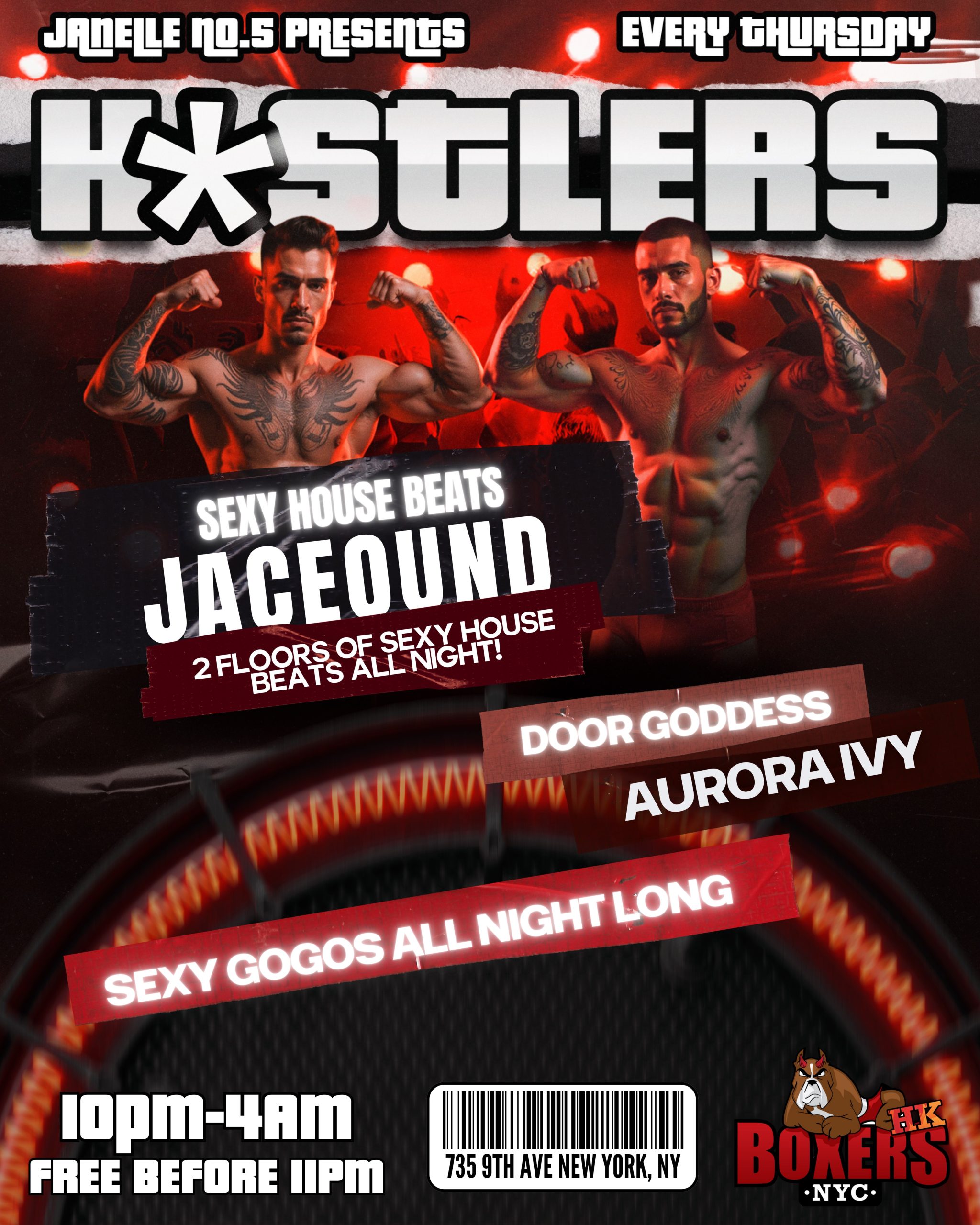 ThursdayJanelle No. 5 presents Hell’s Kitchen’s HOTTEST and NAUGHTIEST party. 2 floors of sexy house beats all night! Every Thursday at Boxers Hell’s Kitchen. 10pm – 4am